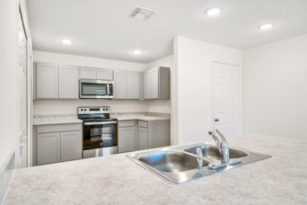 The split plan design ensures privacy and tranquility, with a welcoming master bedroom set apart from the other two bedrooms. The open concept kitchen seamlessly integrates with the living and dining areas, creating a harmonious environment that encourages family gatherings and shared moments. The kitchen itself is a chef’s delight, featuring 30″ upper cabinets for ample storage, as well as a stainless-steel insulated dishwasher for easy clean-up. Completing the ensemble, each home includes a stainless steel electric smooth top range and a stainless-steel microwave complete with a ductless vent hood, light, and fan.