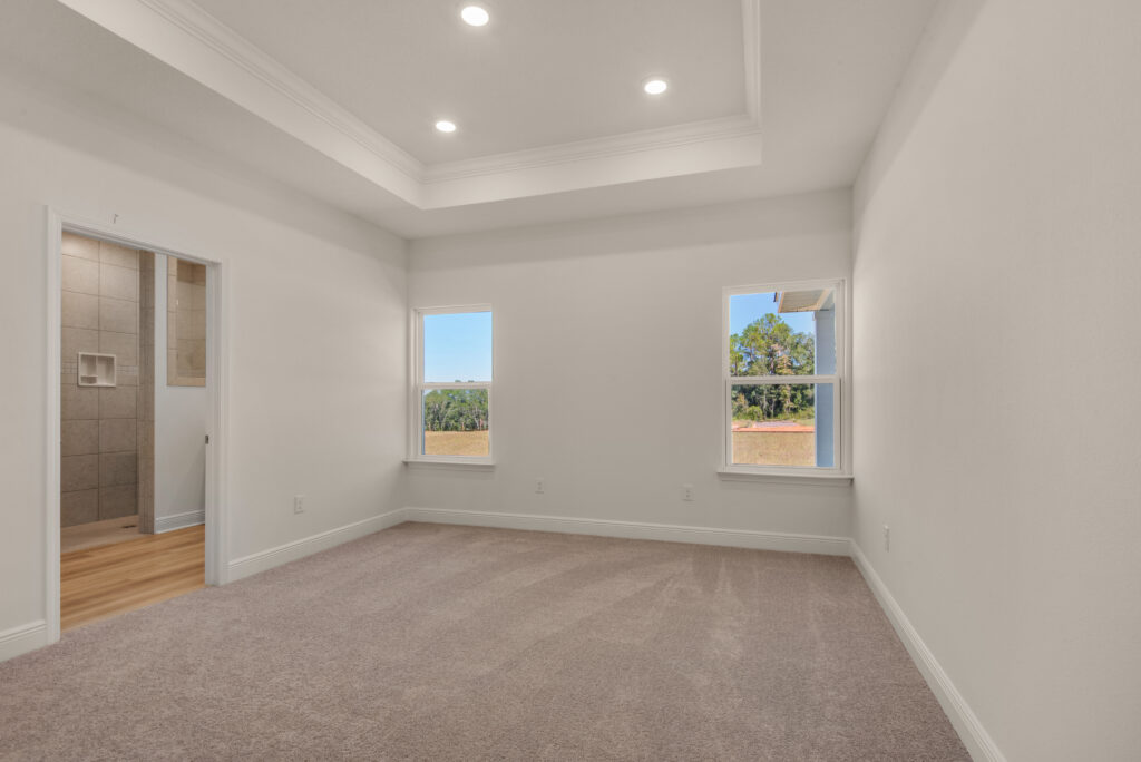 For ultimate privacy, the owner’s suite is tucked away at the back of the home. It features a generously sized walk-in closet and an ensuite owner’s bath, ensuring a tranquil retreat within your own abode. Adjacent to the dining area, you’ll discover another retreatâa full bath and two spare bedrooms, providing a comfortable and convenient space for guests or family members.